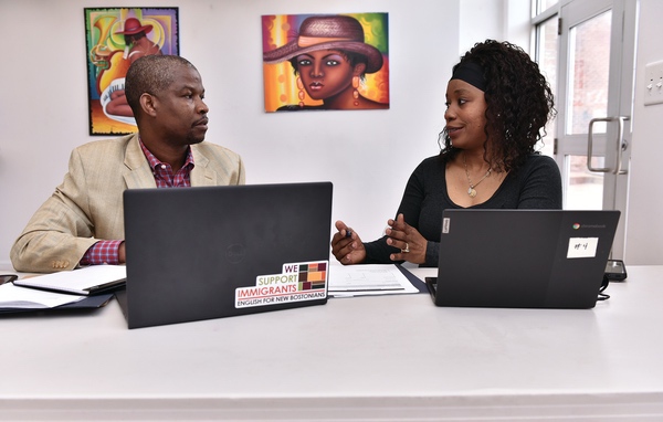 “English is the key to unlocking life here,” says Wilfrix Cherazard, who came to Boston in 2014 from Haiti and now works as a Career Coach for English for New Bostonians (ENB). In Haiti, he was a teacher, journalist and pastor. While a student at the Gilbert Albert Community Center, an ENB ESOL site, he became a student leader advocating for more English classes. He served on ENB’s Board for three years, working as a cook while attending Urban College to earn an associate’s degree in human services administration. ENB brought Cherazard and other career coaches on board as part of its vigorous push for economic recovery and mobility for immigrants. “ENB gives immigrants ‘The Key,’ ” Cherazard said, “and I am happy to help extend that key.”