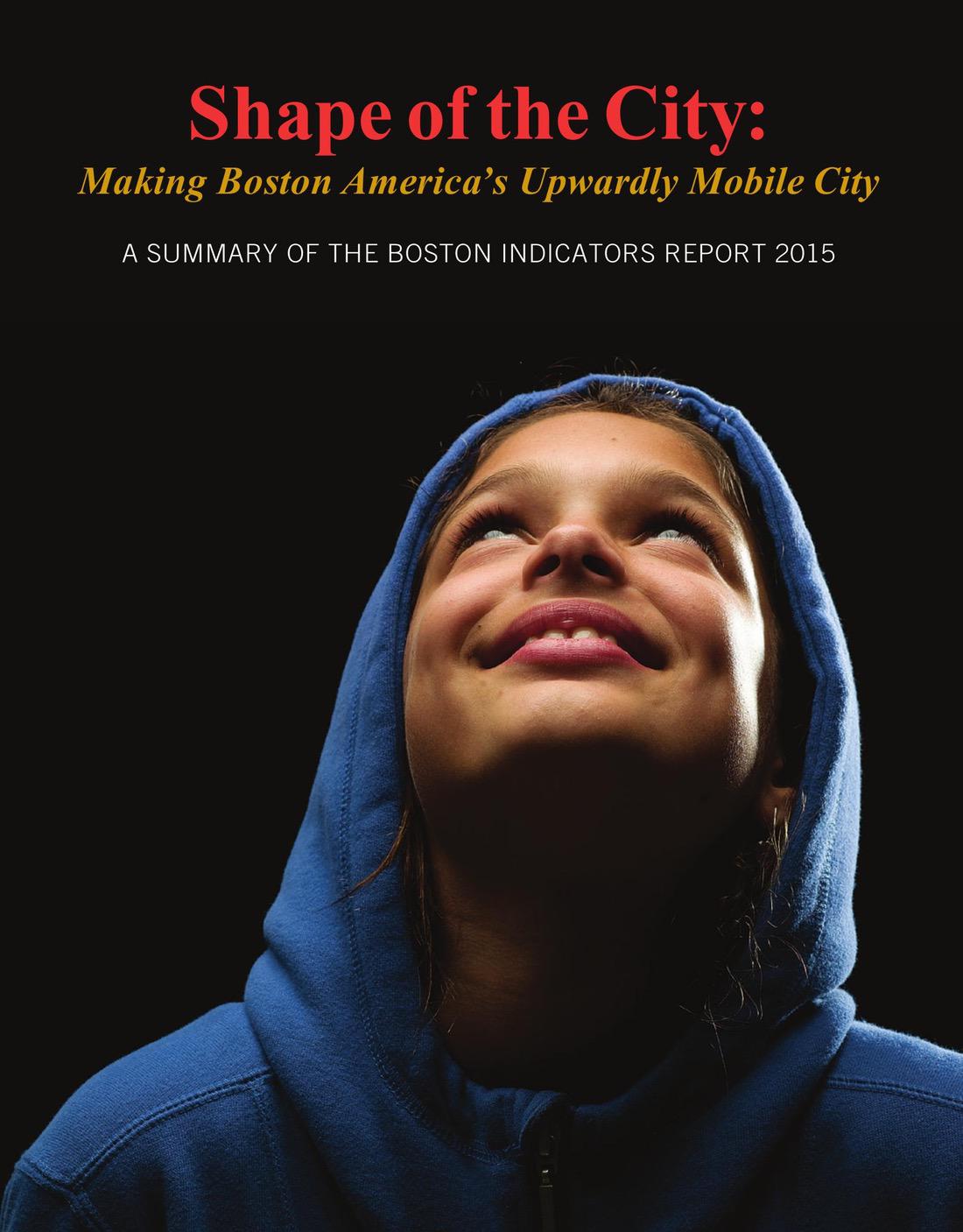 The year 2015 is a watershed for the Boston Foundation, the Boston Indicators Project and the people of our city. It marks the 100th Anniversary of the Boston Foundation and the halfway point of the Boston Indicators Project—a 30-year initiative that will end in 2030, Boston’s 400th anniversary. In this report, the Boston Indicators Project presents data that provide a helpful background vehicle and jumping off point for a very unreasonable goal—Making Boston America’s Upward Mobility City.