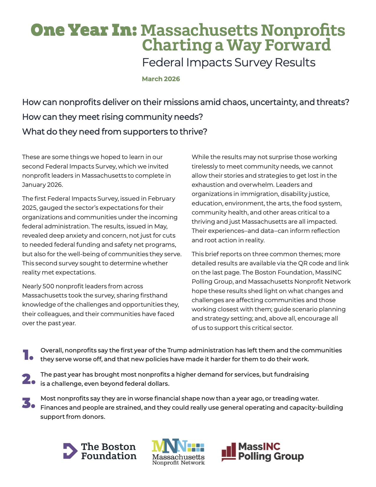 In March 2025, the Boston Foundation, Massachusetts Nonprofit Network and The MassINC Polling Group partnered on a survey of more than 500 Massachusetts nonprofit leaders, asking about thier expectations for their communities and their organizations in the newly-elected trump administration. Almost universally, they expected that federal actions would harm their communities and make their work more difficult.