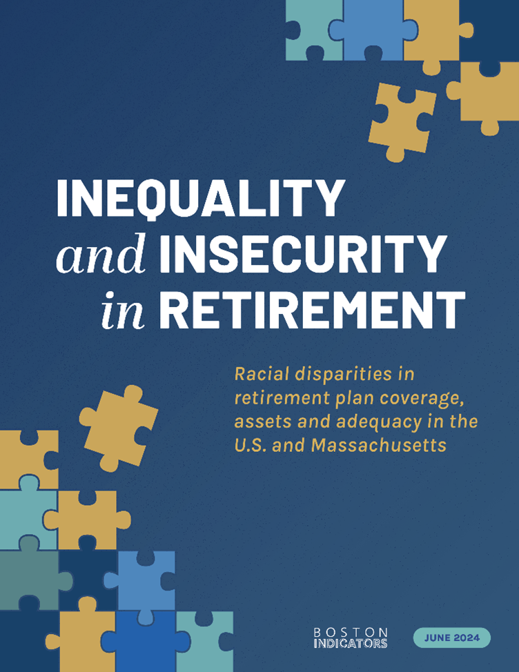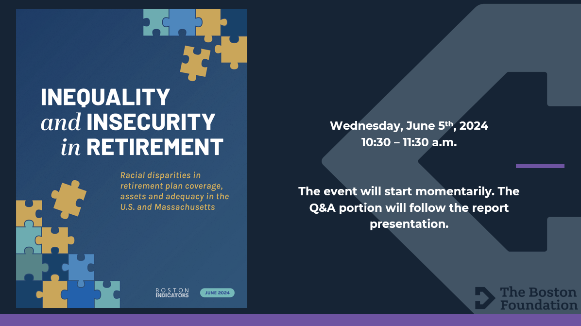 The racial wealth gap doesn’t end in retirement. That was the overarching theme of the June 5 webinar Inequality and Insecurity in Retirement: Racial Disparities in Retirement Plan Coverage, Assets, and Adequacy in the U.S. and Massachusetts, which shared the highlights of a report co-authored by Boston Indicators with researchers from the Federal Reserve Bank of Boston.
